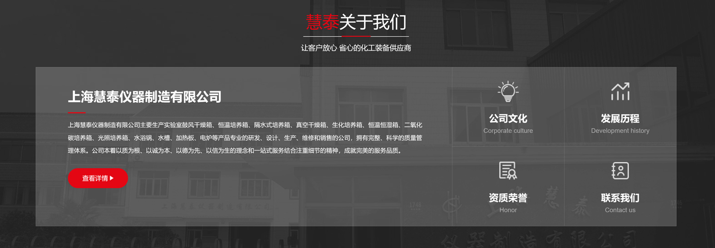 上海慧泰儀器制造有限公司主要生產實驗室鼓風干燥箱、恒溫培養箱、隔水式培養箱、真空干燥箱、生化培養箱、恒溫恒濕箱、二氧化碳培養箱、光照培養箱、水浴鍋、水槽、加熱板、電爐等產品專業的研發、設計、生產、維修和銷售的公司,擁有完整、科學的質量管理體系。公司本著以質為根、以誠為本、以德為先、以信為生的理念和一站式服務結合注重細節的精神,成就完美的服務品質。